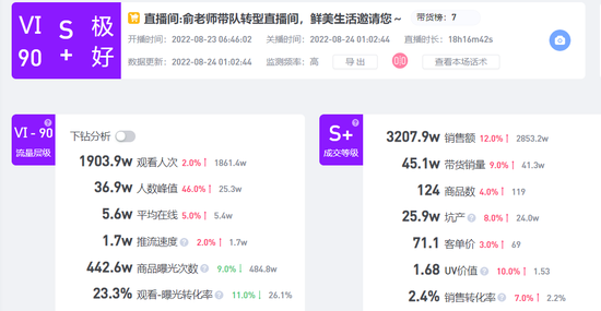 反观东方甄选,其东方甄选之图书直播间,目前拥有粉丝334.8万,最近30天直播销售额1455.2万元;虽然粉丝数量占优,但其直播销售额,却落后于交个朋友次级直播间。 也许,正是因为在自己“隐退”后,交个朋友数据的直线下滑,罗永浩才不得不再次回归。为了从东方甄选手上,重夺“抖音带货一哥”称号,罗永浩此次才会再次现身交个朋友,给小兄弟们“帮帮场子”。此外,或许也正是因为看到了东方甄选“内容直播”带货模式的成功,罗永浩才会不走寻常路,在直播形式上谋求“综艺带货”的创新。 对于这种直播新形式,是否受到东方甄选的启发,潘哥咨询了交个朋友官方,截至发稿,并未收到其回应。 如何重回“一哥”位置 刚刚试水的综艺式带货直播,其效果究竟如何? 潘哥查询灰豚数据发现,这场综艺式直播中,交个朋友、交个朋友酒水食品、交个朋友零食和方便食品、交个朋友美妆护肤四个直播间里,观看人次分别达到99.3万、27.4万、23.1万、26.4万,人数峰值分别达到2万、6735、7113、3891,带货销售额分别为103.6万元、87.5万元、15.4万元、29.2万元,带货销量分别为9908、3989、1.4万、5815。 这样算下来,在这场直播中,交个朋友的四个直播间里,观看人次累计达到176.2万,带货销售额共235.7万,累计带货销量3.4万左右。 这样的成绩,虽然足够让很多小主播欢呼雀跃,但对于罗永浩,这个曾经的“抖音带货一哥”来说,实在算不上好。 毕竟,8月23日当天,东方甄选在18个小时的直播中,观看人次达到1903.9万,人数峰值36.9万,带货销售额3207.9万元,带货销量45.1万件,远远领先于交个朋友。