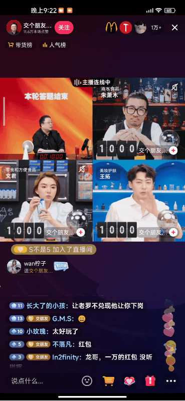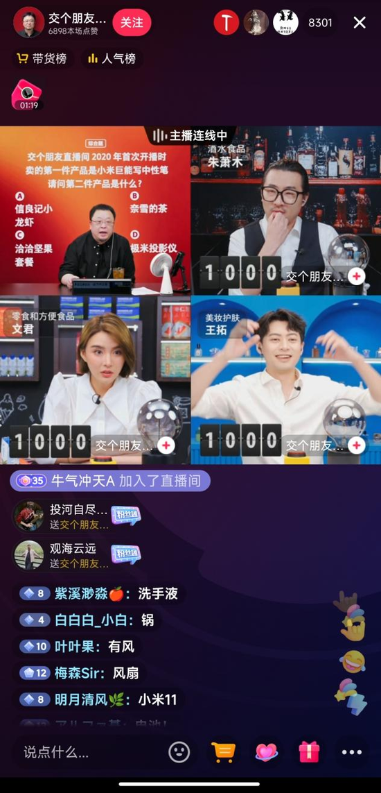 内容直播,卖货前先答题 8月23日晚,潘哥进入抖音交个朋友直播间,意外地发现,罗永浩回来了。 可是,罗永浩这次在直播间并不是C位,而是左上角,交个朋友的另外三位主播:朱萧木、文君、王拓,和罗永浩同框直播。 这次罗永浩重回交个朋友,却似乎不打算卖货,他兴冲冲地向观众宣布:今晚的交个朋友直播间,将进行一场有奖知识竞答活动,主持人是自己,而参赛的三位选手,则是朱萧木、文君和王拓。 一个带货的直播间,突然玩起了综艺答题,真是令潘哥感到“活久见”,而等到答题正式开始,潘哥才发现,交个朋友这样“整活儿”,似乎在尝试一种新的带货方式。 答题刚一开始,罗永浩就向选手抛出了第一个问题:交个朋友直播间,2020年开播时买的第一件产品,是小米巨能写中性笔,请问第二件产品是什么?