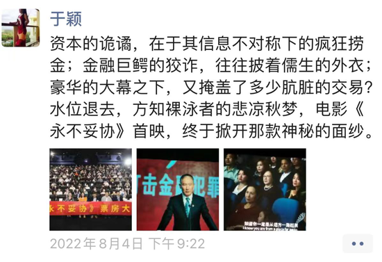 即便亲历了如此多惊险事件,李德林依然鼓励年轻人进入媒体行业:“年轻人有无限可能,犯错不要紧,重要的是我们得去想、去做,努力去采访、去写稿、去见识更多的人。对于年轻人来说,媒体行业是快速成长的跳板。真相往往难以触达,我们看到的真相只是一面或两面,但真相往往是一个六面体,这就需要媒体行业的年轻人去无限接近真相。” 电影定档之后,于颖在朋友圈写下:资本的诡谲,在于其信息不对称下的疯狂捞金;金融巨鳄的狡诈,往往披着儒生的外衣;豪华的大幕之下,又掩盖了多少肮脏的交易?水位退去,方知裸泳者的悲凉秋梦,电影《永不妥协》首映,终于掀开那款神秘的面纱。