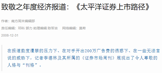 在《周刊》承受着前所未有的压力之时,媒体开始接力挖掘真相。2008年两会期间,《第一财经日报》首席记者陆媛拿着封面报道为《太平洋证券上市路径》的3月刊,堵到了时任证监会副主席范福春,范福春还在杂志上批示:“办公厅:请将此件反映的问题向记者说一说。”后来,陆媛将这本杂志送给了李德林。