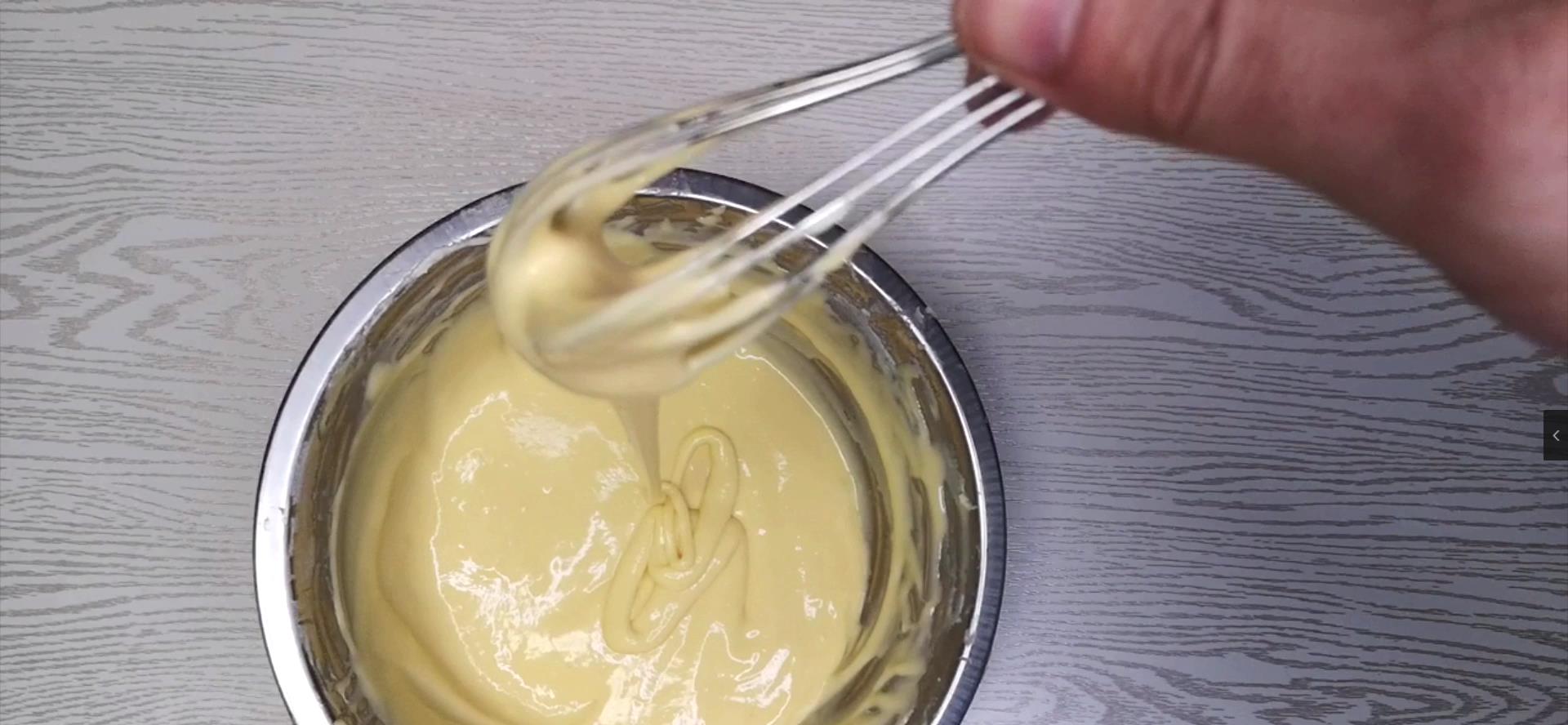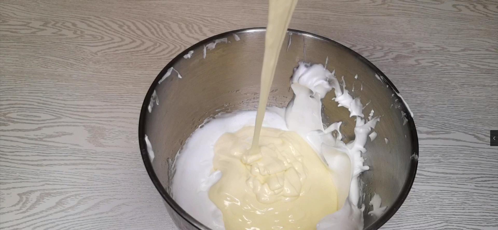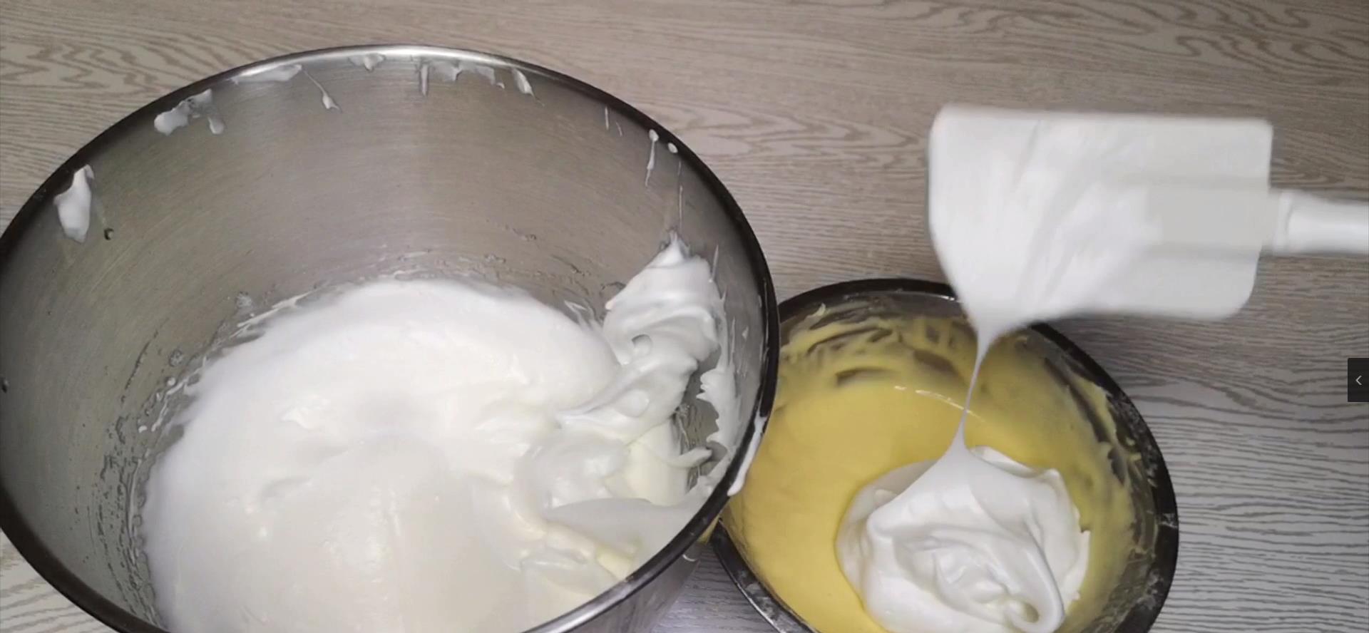 挖1/3蛋白霜进面糊,抄底搅匀。