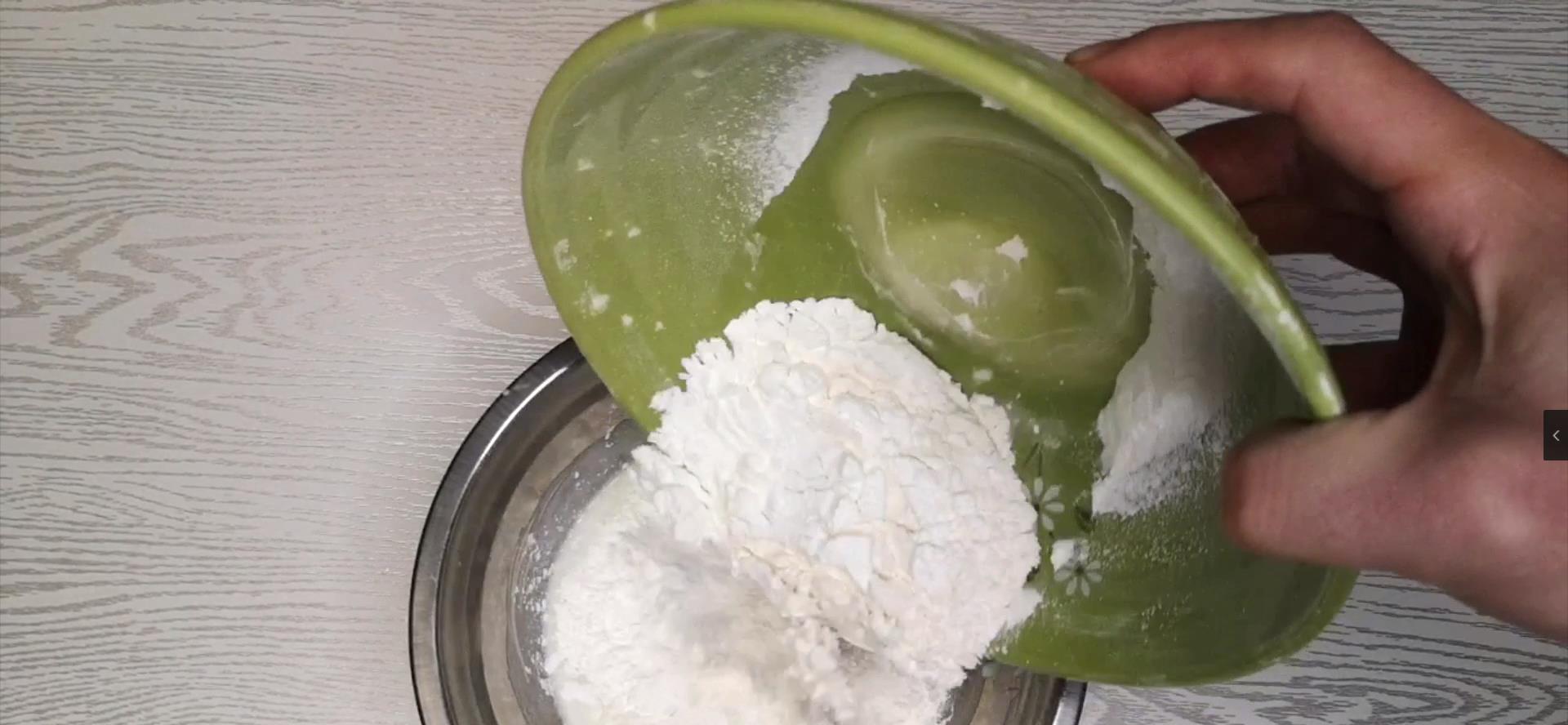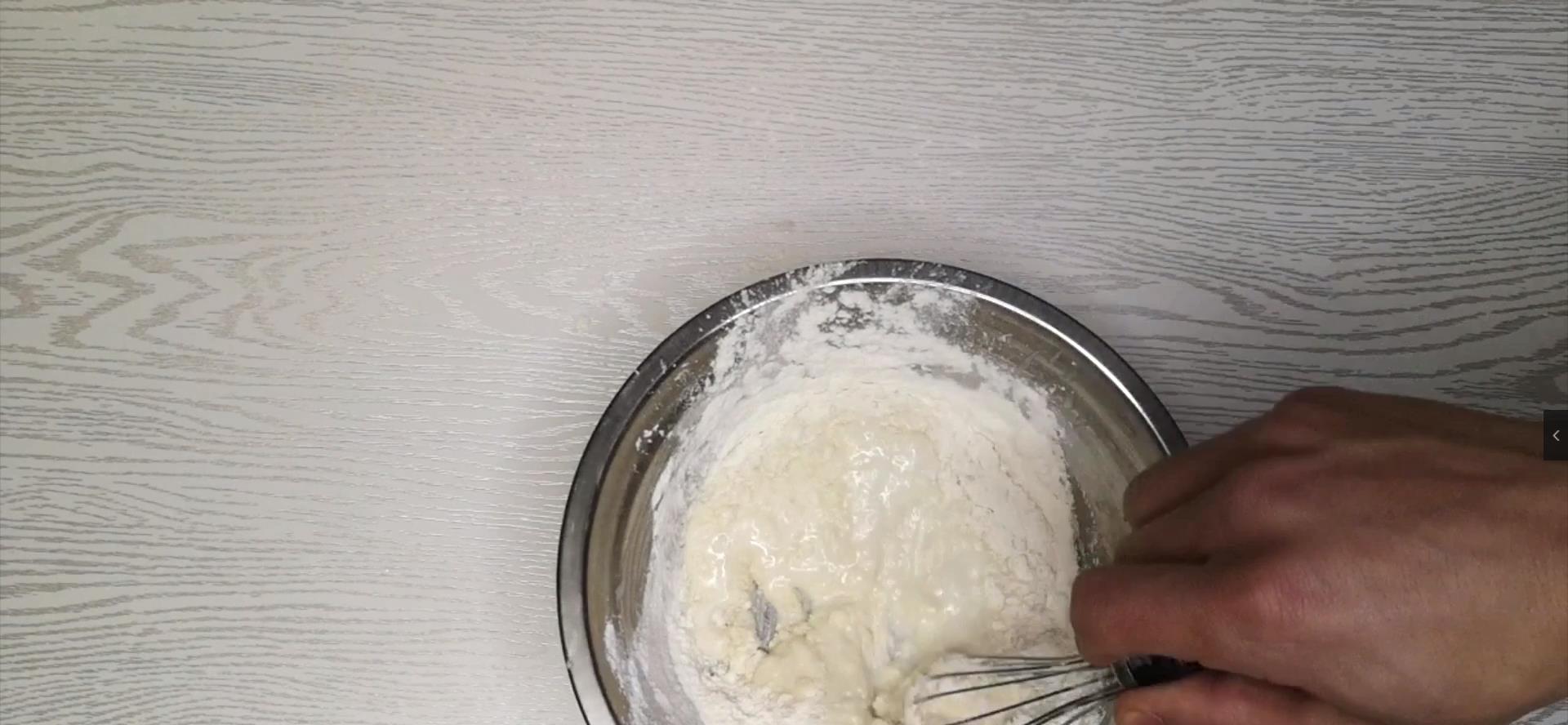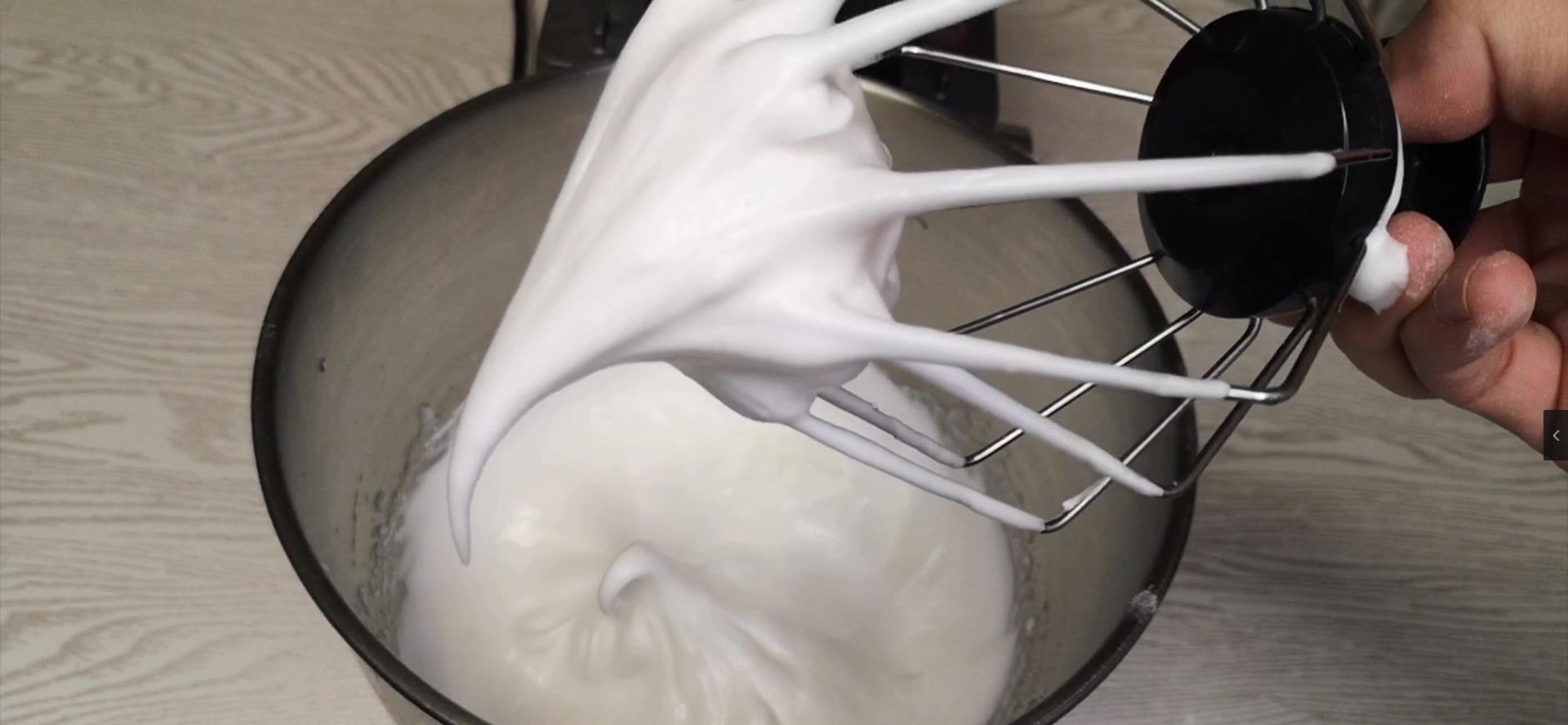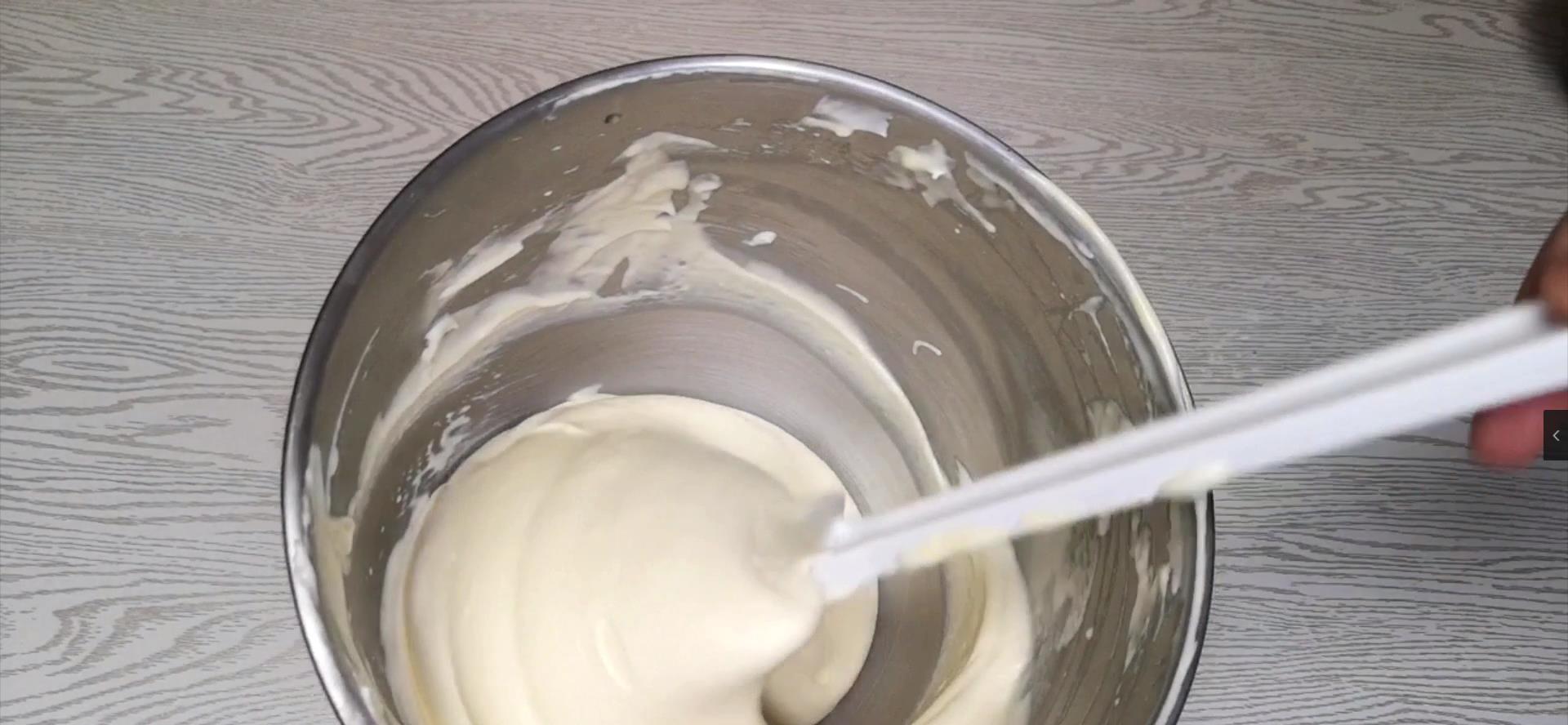 挖1/3蛋白霜进面糊,抄底搅匀。