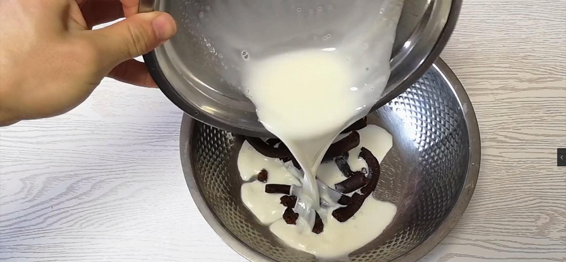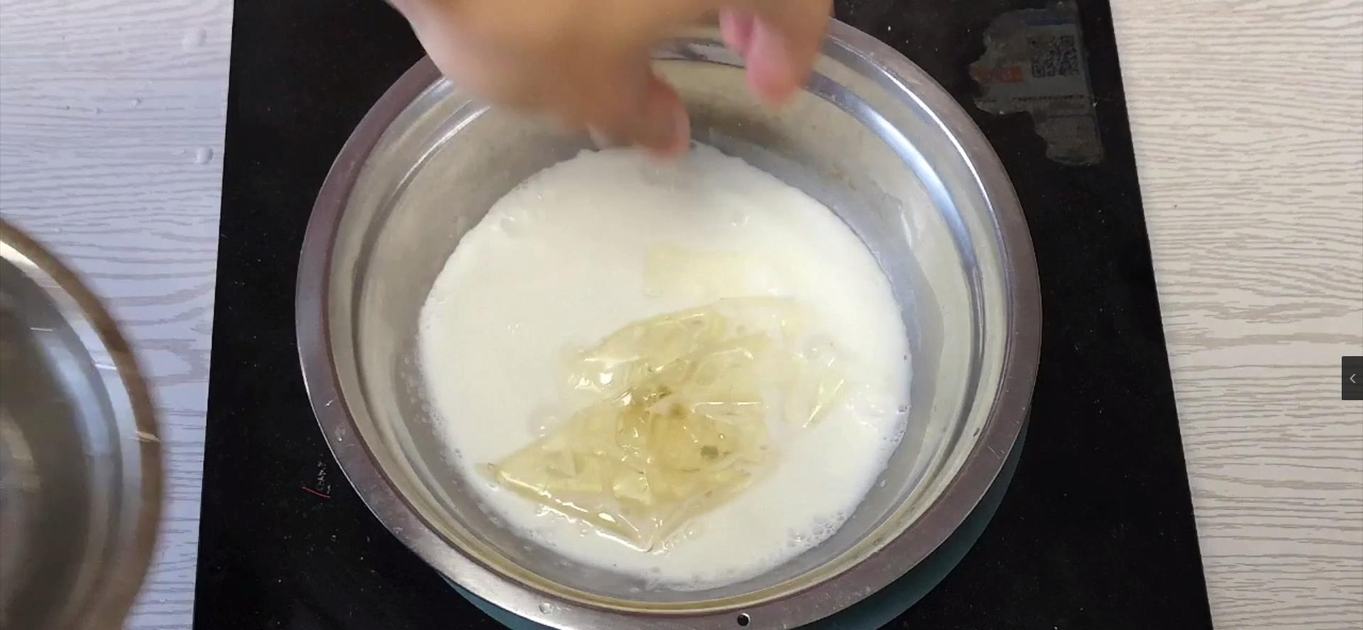 牛奶煮开后加入软化后的吉利丁片搅匀。