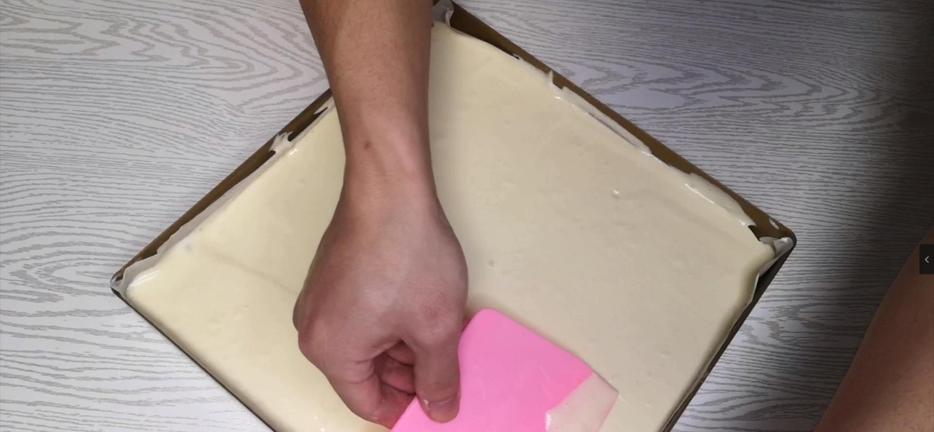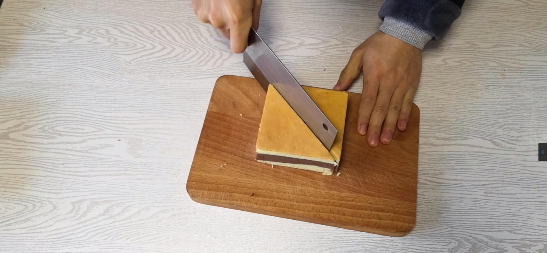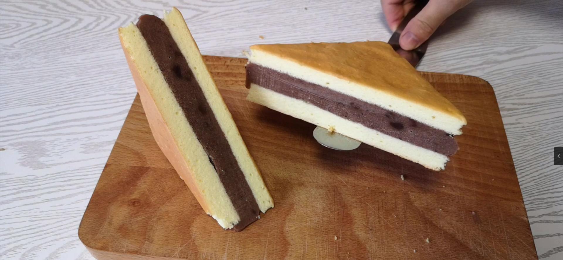 放冰箱冻1小时后拿出来,如果蛋糕冻住了就用热毛巾加热脱模。 用刀把侧面切平后,从中间一刀切开。
