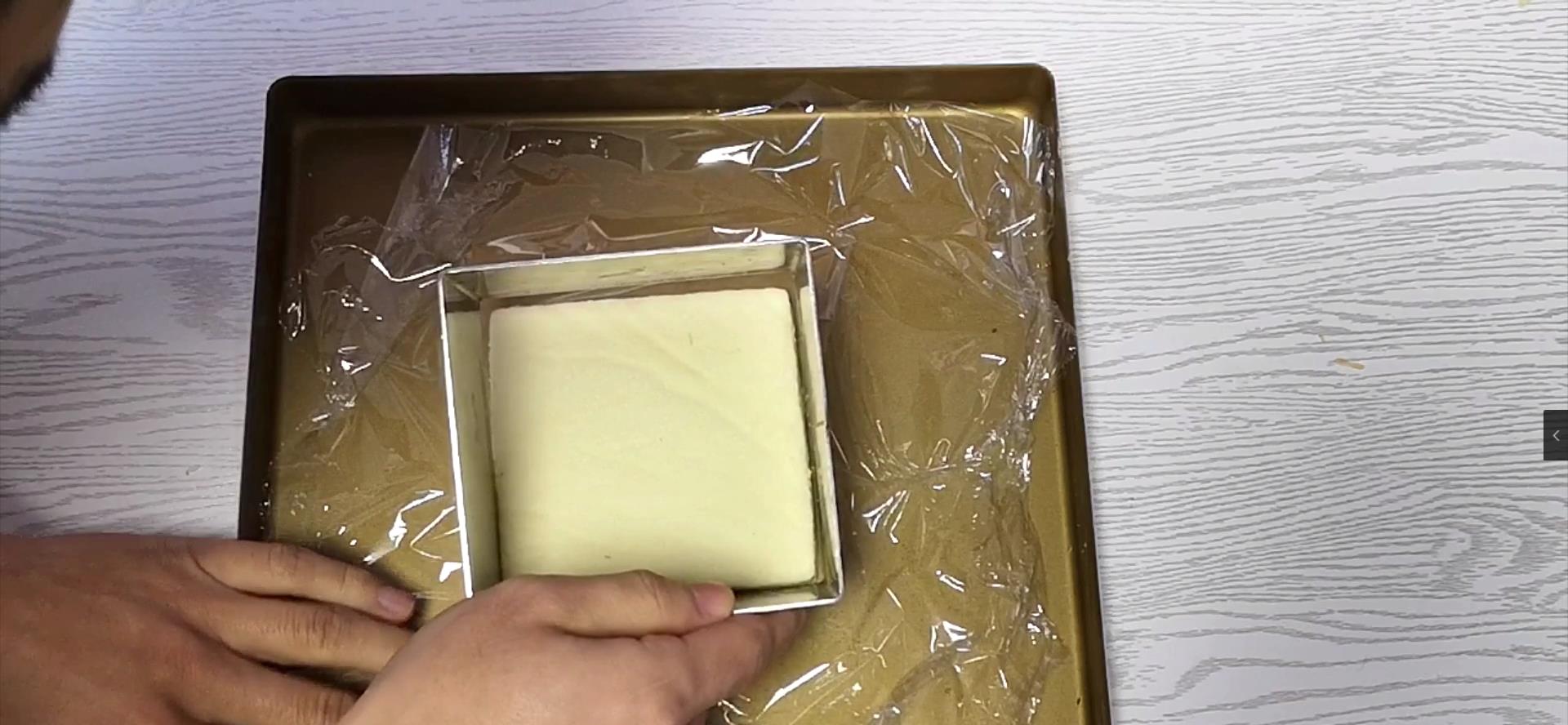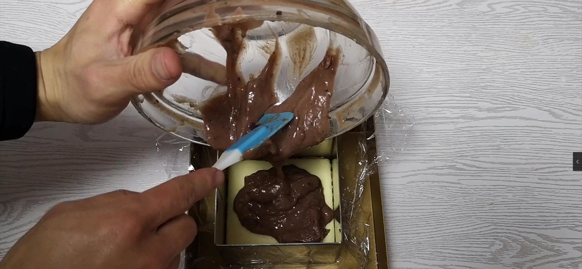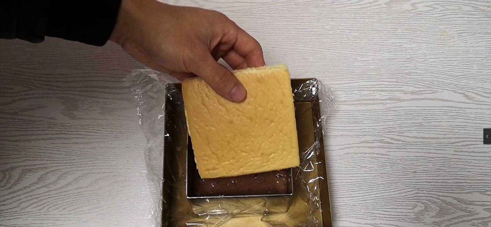 底部垫个保鲜膜蛋糕胚底部朝上,模具扣进去。
