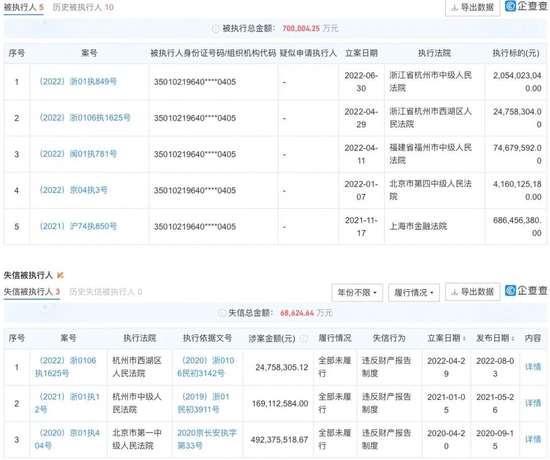 由于上述质押股票融资违约,法院裁定拍卖(变卖)被执行人叶荔所持有的8000万股股份,并要求金元证券协助执行。金元证券于是通过集中竞价交易方式司法处置叶荔持有的2489万股公司股份,占公司总股本的1%。 据不完全统计,自2020年泰禾暴雷以来,ST泰禾控股股东及一致行动人叶荔已发生至少五次被动减持。 截至7月12日,泰禾投资及一致行动人叶荔已合计被动减持1.94亿股,占ST泰禾总股本的7.8%。上述减持后,泰禾投资及叶荔合计持有股份数为13.67亿股,占ST泰禾总股本的54.89%,其中所持股份累计被司法冻结股数为13.67亿股,占总股本的54.89%,也就是说全部被冻结。 后续,泰禾投资及其一致行动人仍存在被法院判定强制执行被动减持股份的风险。根据叶荔函告,其目前正在与相关债权人进行协商工作,以稳定股权。 此外,据乐居财经获悉,叶荔持有泰禾价值3亿元股权数额,被福建省福州市中级人民法院冻结,冻结日期自2022年1月24日至2025年1月24日。 眼下,叶荔所牵扯的司法案件高达347起,案由囊括了金融借款合同纠纷,不当得利纠纷、信托纠纷等等。 不仅如此,她还身负5次被执行记录,被执行总金额高达70亿元,并有六次“限高”记录,申请人包括了中原信托、浙江稠州商业银行、杭州博予投资管理合伙企业(有限合伙)和中合中小企业融资担保。 更为致命的是,叶荔还有三次被列为“失信被执行人”,已成为一名妥妥的“老赖”,失信行为是违反财产报告制度,失信总金额达6.86亿元。