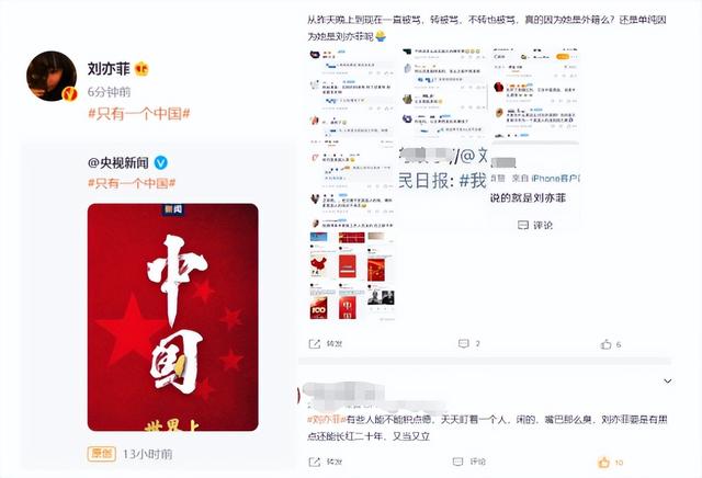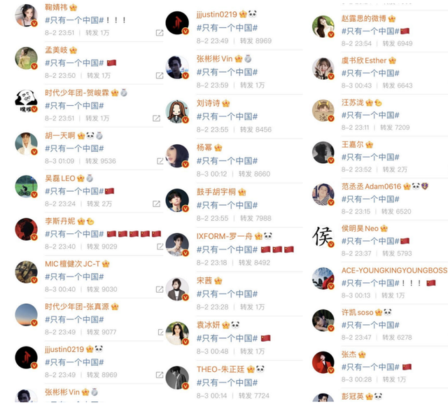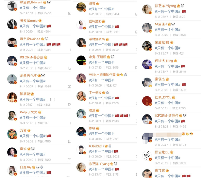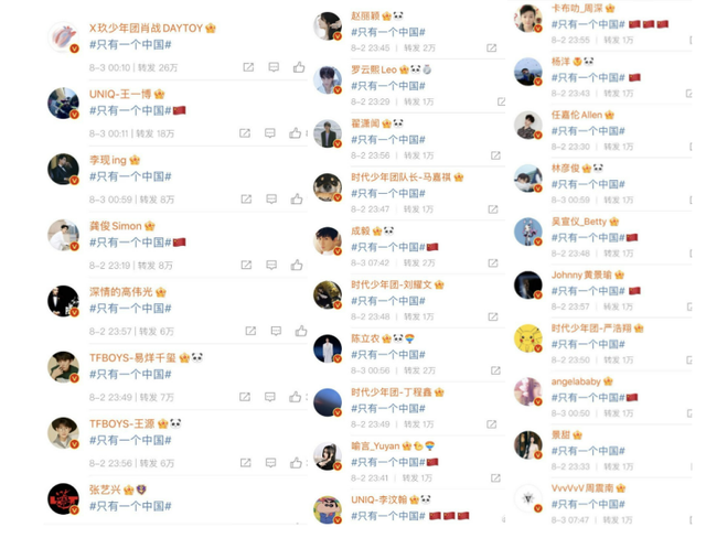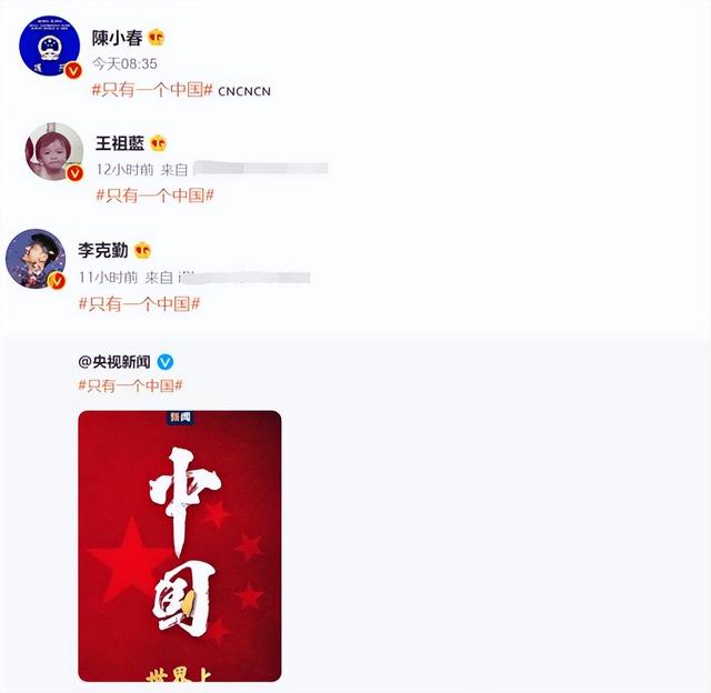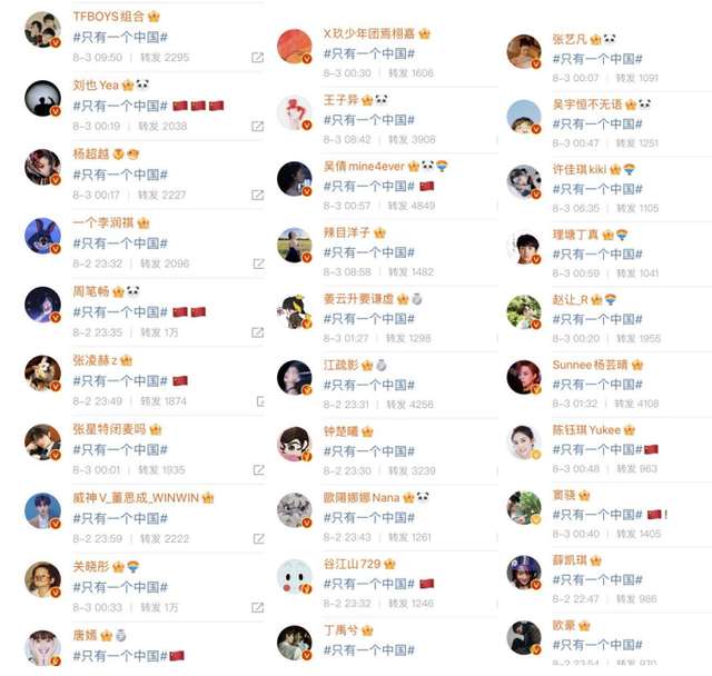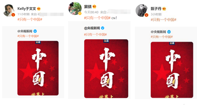 圈内的艺人们也在社交平台上第一时间转发了“只有一个中国”的话题词,表达出了自己的态度。
