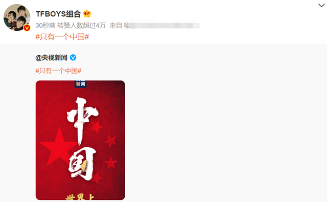 就连久未发动态的内地偶像组合tfboys都及时转发了央视新闻的“只有一个中国”立场,表明了自己的坚定决心与坚持“一个中国”原则的观点。