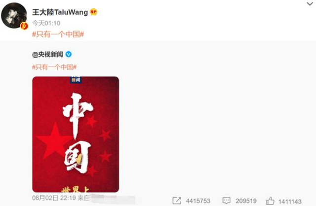 台湾演员王大陆也是凌晨及时转发,着重陈述了“只有一个中国”的坚定立场。