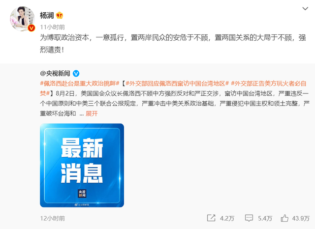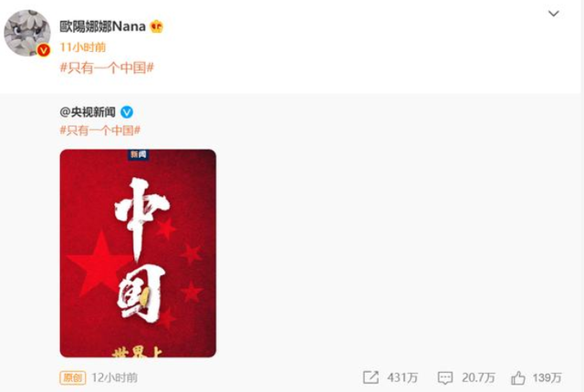 欧阳娜娜更是首当其冲第一时间就转发了该条推文,体现了台湾是中国不可分割的一部分的坚定立场。