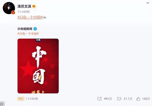 台湾女演员文琪也是第一时间转发了该条推文,并且配文“CN”,体现了其坚定的爱国信念。