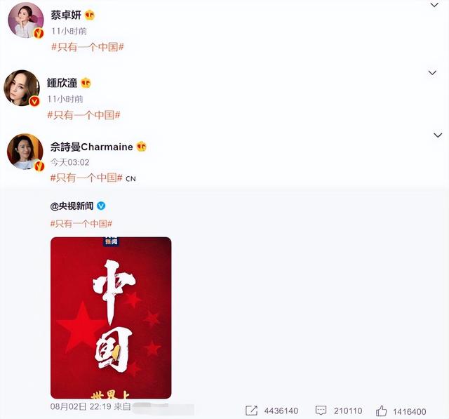 与此同时,娱乐圈许多港台明星也都转发了央视新闻的“只有一个中国”立场,体现了他们的爱国决心。其中不少台湾艺人更是勇敢发声,不惧流言,在大是大非之下,坚持自己的爱国主张,坚决维护祖国统一。