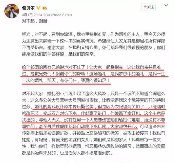 伴郎团们都噤声不言。 4天后,包贝尔才站出来发文道歉,但话里话外都在维护兄弟团。 他称,婚礼的游戏设计原本要玩撕名牌,但是因为衣服被海关扣了,只能临时修改环节,变成双方对抗下水,伴郎赢了进门,伴娘赢了拿红包。