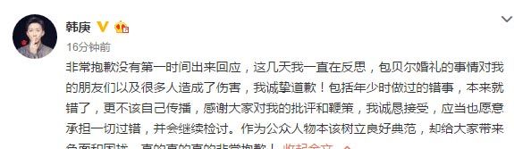 “让她挣到1分钱,在坐的都有责任。” 路人缘能坏成这样,两口子又能在娱乐圈走多远呢? 03韩庚 包贝尔道歉的第3天,韩庚也没躲过舆论的口诛笔伐。 他也在社交平台上发文道歉。 虽是道歉,却字字没提柳岩。