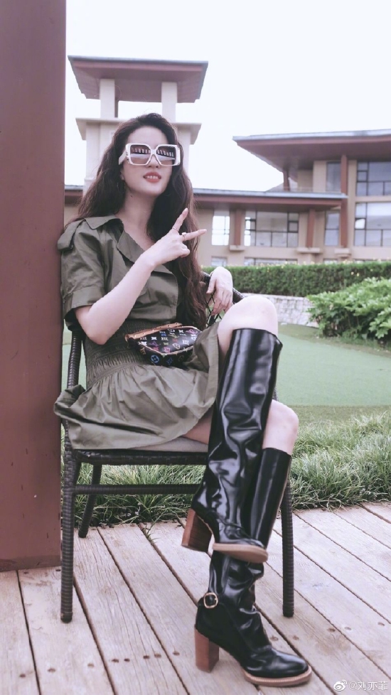 刘亦菲四宫格美照,军绿色连衣裙配长靴戴墨镜酷飒十足。