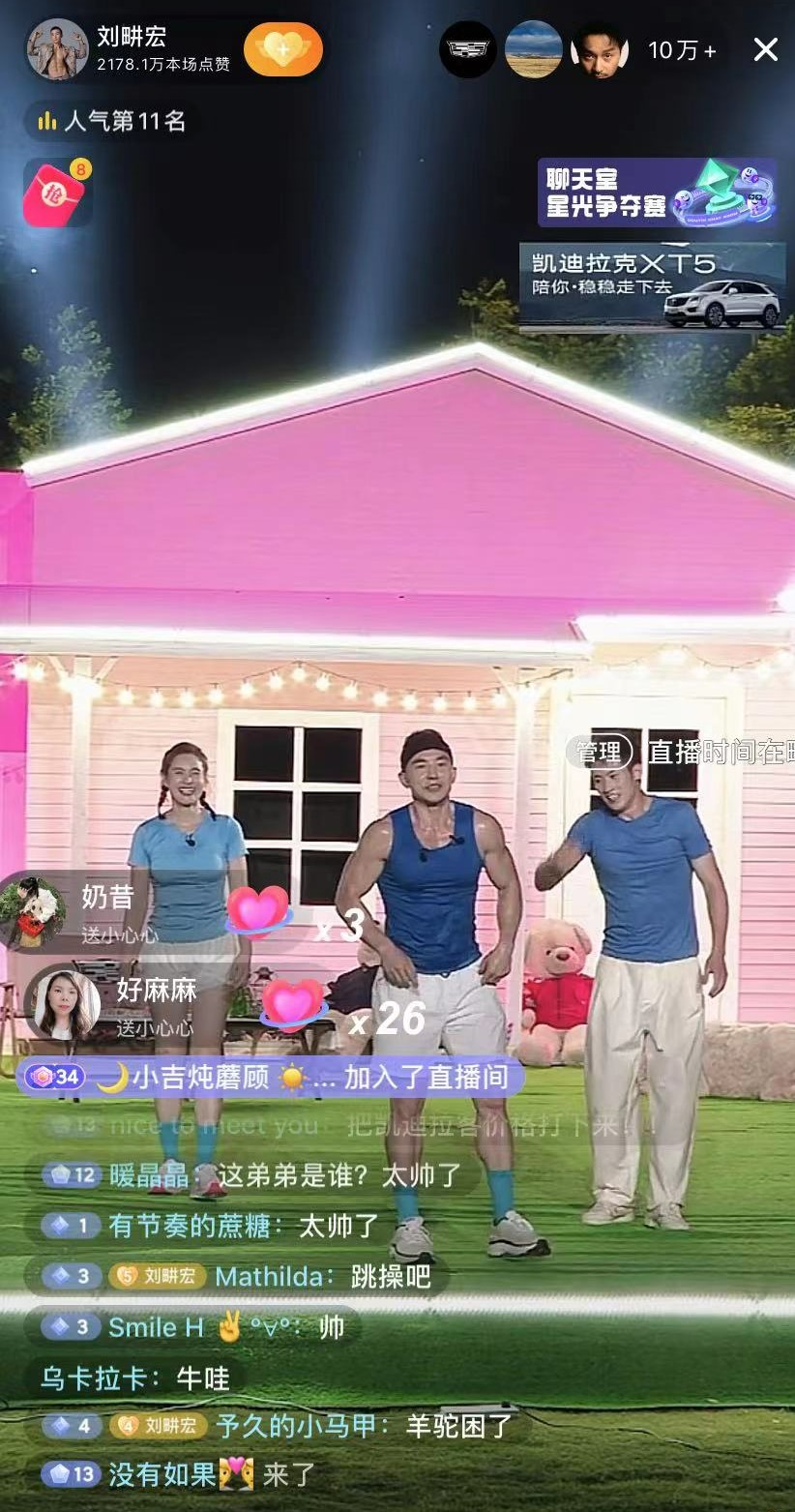 图片来源:刘畊宏微博 7月3日晚上19点30分,因居家直播健身出圈的刘畊宏在浙江莫干山开启首场户外直播,通用汽车旗下豪车品牌凯迪拉克为直播提供冠名赞助。 截至开播前3小时,刘畊宏账号直播预告视频收获点赞18.6万,评论近7000条,直播预约人数达到273.8万。 从直播画面可以看到,现场布景风格十分浪漫,一大片绿色草坪上,搭建了粉色房子和秋千架,以灯串装饰,凯迪拉克车辆停放一旁。相关工作人员告诉时代财经,开播前一天,刘畊宏团队布景、彩排到深夜。 不过,当晚直播还是出现了一些小插曲。 一方面,由于网络设备问题,开播后画面出现卡顿情况,并伴有杂音。此外,开播前的介绍时间过久也引起粉丝不满,弹幕多为“十分钟了,别磨叽了”“还不如室内跳操,搞得像一个综艺一样”“开始吧教练”“下回还是室内吧”。
