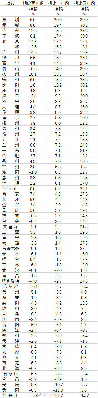 与此同时,洛阳、秦皇岛、大理、呼和浩特、乌鲁木齐5个城市相比于5年前涨幅超过20%;桂林、包头、南宁、长春、吉林、哈尔滨、襄阳以及牡丹江8个城市涨幅超过10%。 另外,除了牡丹江,新一线城市郑州房价相比于5年前跌幅也较高,为8.4%; 其次是三线城市安庆,跌幅为3.7%;石家庄、天津以及湛江跌幅分别为2.4%、1.7%和0.7%!