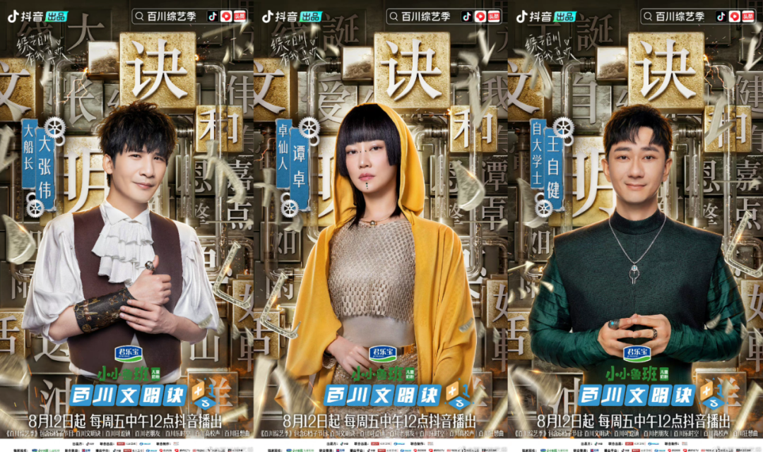 如今短视频平台进军大众综艺,亦是在打破短视频特征下的平台局限性。在“短视频向长”的节目布局中,平台方精耕节目主题,系统化地对自制内容进行提质,综艺叙事节奏也因时长变得更宽容而随之慢下来,有利于实现内容深度的探索。 抖音平台已播出的《百川文明诀》将猜词游戏置于科幻荒诞、充满喜剧元素的背景之下,箕斗星人在大船长(大张伟饰)、卓仙人(谭卓饰)、自大学士(王自健饰)的带领下要飞往地球中国,为了保证能源的正常供给,他们通过猜词游戏学习中华语词文化,找到最默契的灵魂搭档。