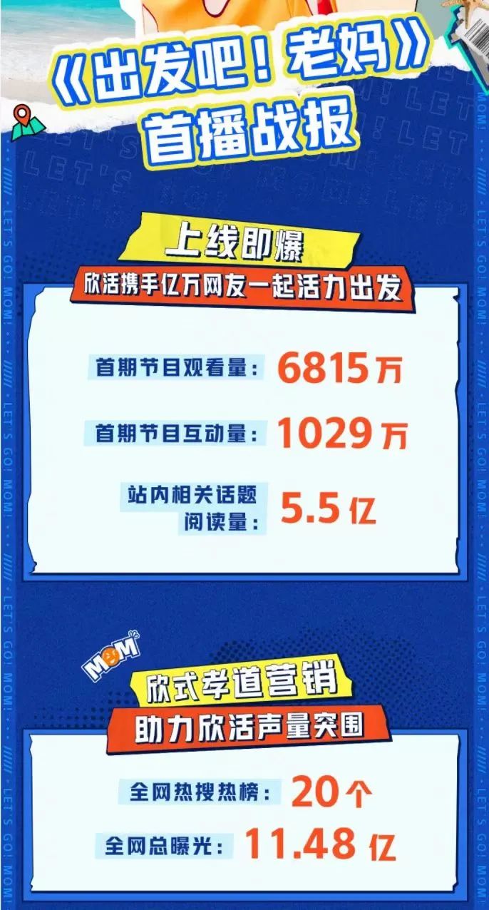 节目嘉宾的妙语横生引起场上阵阵爆笑,选手挑战自我极限,在轻松愉快的氛围中,中国语词文化的魅力也渐渐显露出来,为节目附加上一层科普性质的文化色彩。 投眼于《百川综艺季》的其他子节目,《百川可逗镇》依托于当下普遍存在的社会压力而产生,节目主打解压,打破许多大众共有的情绪困境;《百川乐时空》和《百川高校声》同样以音乐为引,却指向两个截然不同的细分切口,演绎经典音乐和“年轻的声音”;《百川狂想曲》为循规蹈矩的生活注入新的人生想法,将喜剧与人生愿望进行联系;《百川老朋友》将受众圈层定格至中老年单身人群,将代际关系的投入至内容创作之中。 快手《出发吧!老妈》一经播出便受到了较良好的反馈。除了完整版节目之外,快手出品还剪辑了精华版、高光时刻等短视频来丰富节目内容,满足了用户碎片化的消费需求。节目首期观看量超6815万,互动量超1029万,站内相关话题阅读量超5.5亿,“父母让你社死的瞬间”“你的理想型父母是什么样的”等话题登上热搜,引发网友的大量讨论。