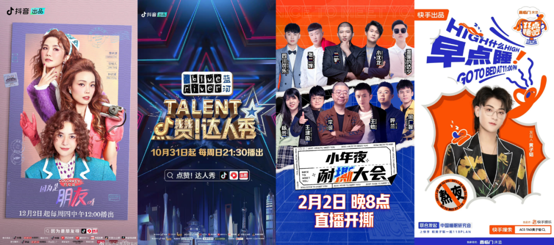 作为短视频阵营中强有力的竞争对手,抖音和快手在自制综艺的赛道上多向布局,早已吹响竞争号角。2020年至今,抖音推出了《很高兴认识你》《为歌而赞》《因为是朋友呀》《点赞!达人秀》等多档不同类型的自制节目,而快手也上线了《耐撕大会》《冰雪队队碰》《11点睡吧》《时空店铺》等节目,同样着力于细分题材,摸索着符合平台定位的节目自制玩法。