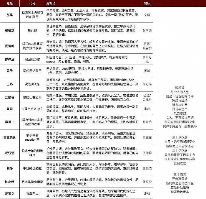 01 人设与真实 2020年1月,湖南卫视导演吴梦知有一个“荒诞”的想法,想做一个让30位姐姐成团的真人秀。此前,她曾执导过《超级女声》《花儿与少年》《妻子的浪漫旅行》等节目。 带着这个想法,她找到了BKW团队。这是一个创办于2013年,集投资出品、策划制作、后期于一体,并将目光逐渐瞄向综艺市场的专业团队。她需要他们在可能高达几十万G的海量素材中,剪辑出具有悬念冲突的故事,从而对观众呈现出这些人物的个性魅力。 于是,产生了《浪姐1》中敢于向规则发出质疑的宁静,“还要我介绍我自己?那相当于我这几十年都白干了,都不知道我是谁。”有了敢说敢干的虎妞张雨绮,高喊着“我就要C位”,拿着其实是代表差生的X牌,莫名自信地笑说,“X 意味着无限肯定啊”。