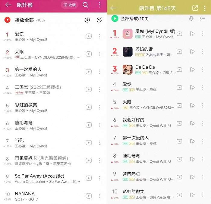 图:两季人设对标部分截图 但成也人设,败也人设。 《浪姐2》最大的失败之处在于,嘉宾们没有足够的实力去支撑对应的人设,显得漂浮。真实不做作的张馨予成了中性风的憨憨,敢爱敢恨的张柏芝成了应付了事的捞金女,不惧野心的陈小纭成了阴阳怪气的小作精。 来到2022年,很明显地看出《浪姐3》做了一些改变。嘉宾们实力强悍,30位姐姐无一不是在特定领域具有代表性的人物,回归了节目主题“展现30+女性的多元化之美”。 悬念设置看起来也很满。比如第一期,前两季冠军宁静那英的强强对抗显然是制造话题的重点。“有人拿你和宁静比,你怎么看。”“你比以前变漂亮。”“但我没整。”“不想说,怕你生气,因为我儿子比你儿子年纪大。”“哦,早婚早育。”在微博,宁静那英打起来的话题,有2.9亿阅读量,8.5万讨论。 只是,在节目组意料之外,跑出了一匹黑马:王心凌。 她以一己之力,拉动了整个节目的收视率,使其成为爆款。首秀《爱你》表演1分钟左右,却以图文,音乐,影视各种载体形式,席卷全网榜单。微博#王心凌超10亿阅读,141万讨论。她的个人热度,覆盖到以往所有作品,并由此引发了连锁热搜效应。过往歌曲,mv,影视,以及合作过的男演员,纷纷被带上热搜。王心凌男孩们更身体力行跟跳《爱你》,并用真金白银支持节目背后公司的股票,一度使芒果超媒盘中一度涨近10%。